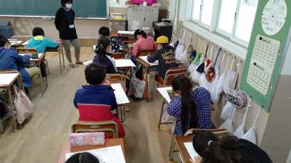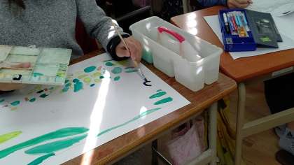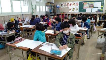 1時間目、5年生が図工の学習をしています。「名画の模写」をしています。