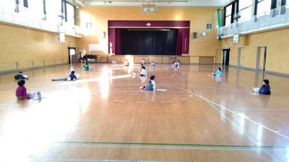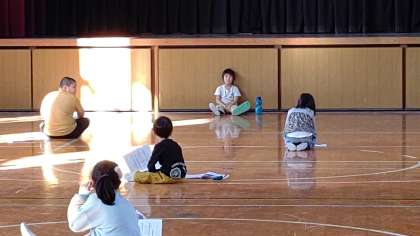 5時間目、1年生が講堂で音楽の学習をしています。密にならないように離れて座り、大きな声で歌っています。