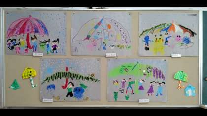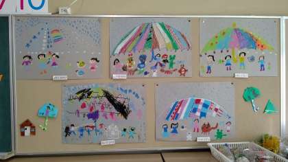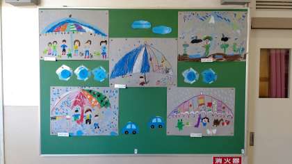 1年生の作品が、教室の後ろの掲示板と廊下に掲示していました。