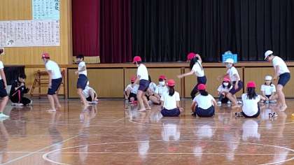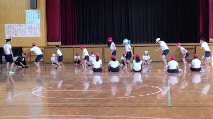 2時間目、6年生が講堂で体育の学習をしています。体力テスト「反復横跳び」をしています。