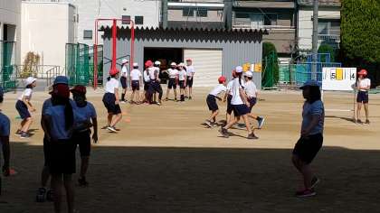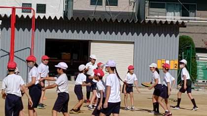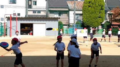 3時間目、5年生が運動場で体育の学習をしています。「アルティメット」のゲームをしています。