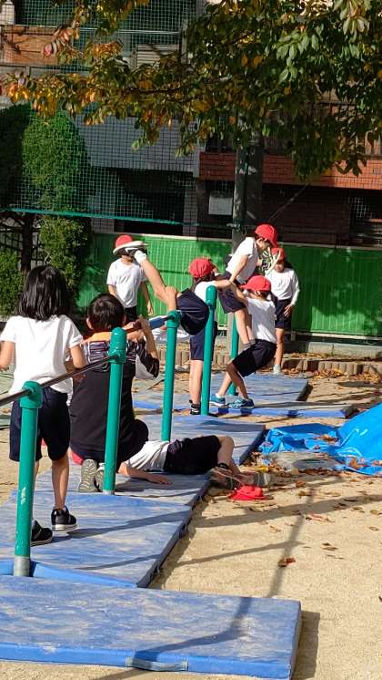 5時間目、2年生が運動場で体育の学習をしています。「鉄棒の連続前まわり」の練習をしています。