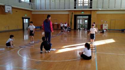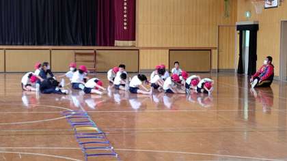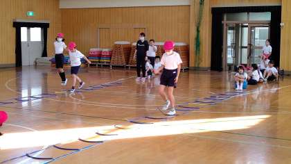 5時間目、3年生が講堂で体育の学習をしています。「陸上」の走る練習をしています。ゴムラダーを使って、練習しています。みんな楽しそうです。