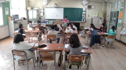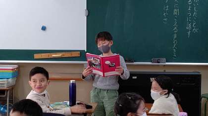 1時間目、2年生が国語の学習をしています。自分が紹介したいことを、みんなの前で話しています。