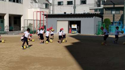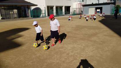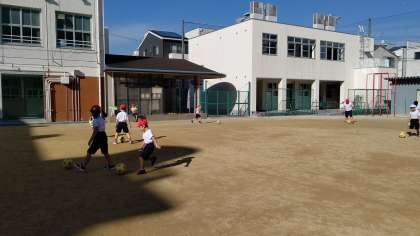 2時間目、1年生が運動場で体育の学習をしています。「サッカー」の練習をしています。