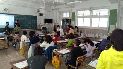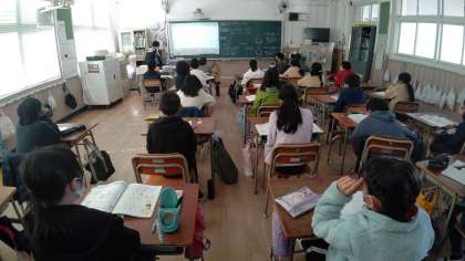 3時間目、4年生が理科の学習をしています。「空気の膨張と収縮」について学習しています。