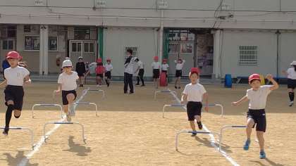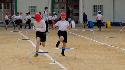 3時間目、4年生が運動場で体育の学習をしています。「ハードル走」を練習しています。ハードルの間隔を変えてあります。どちらが自分にあっているか試しています。