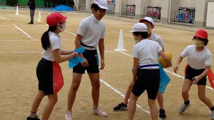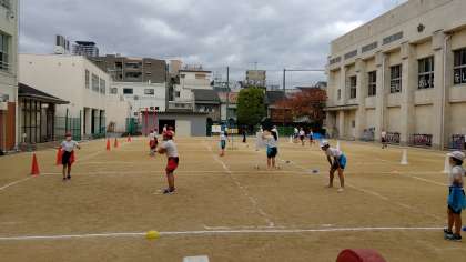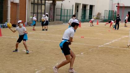 4時間目、6年生が運動場で体育の学習をしています。「フラッグフット」のゲーム練習しています。
