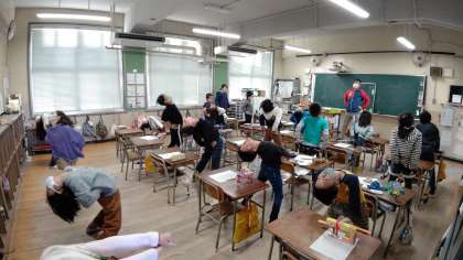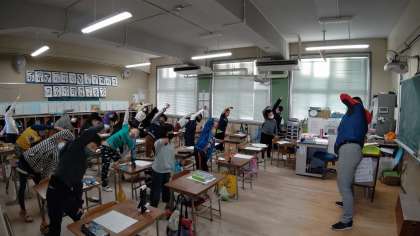 3年生が、朝の学級活動でラジオ体操をしています。教頭先生が指導しています。
