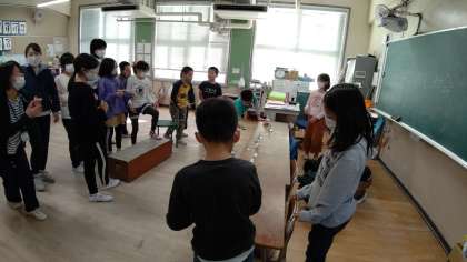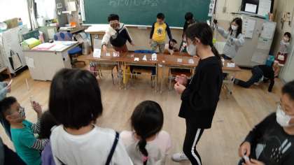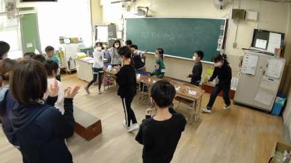 5時間目、3年生が「おたのしみ会」をしています。ゴム鉄砲を楽しんでいます。