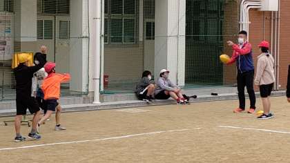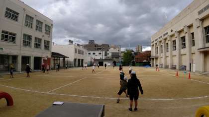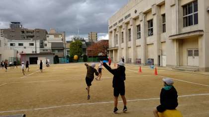 6時間目、6年生が運動場で体育の学習をしています。「タグフット」ラグビーとアメフトの間にあるようなスポーツです。ラグビー経験者の教頭先生がアドバイスしています。