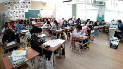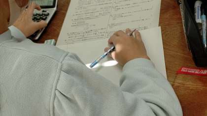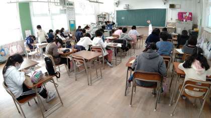 3時間目、5年生が算数の学習をしています。「割合」について、テストをしています。電卓を使って計算しています。