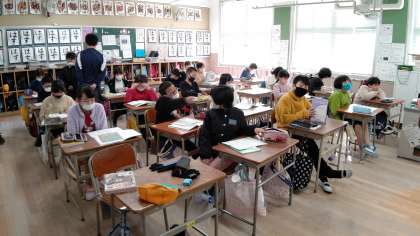 2時間目、4年生が国語の学習をしています。「ふるさとの食」を伝えようについて学習しています。自分が選んだ食のリーフレットを作っています。