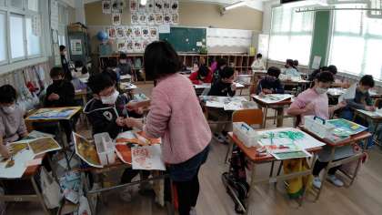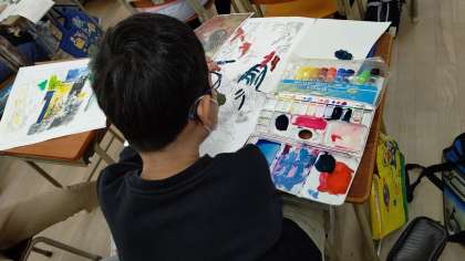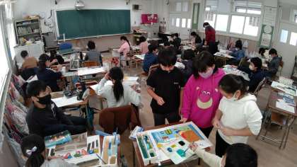 1時間目、5年生が図工の学習をしています。「名画の模写」を完成させています。