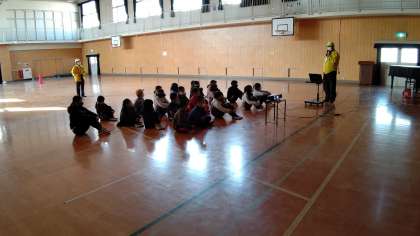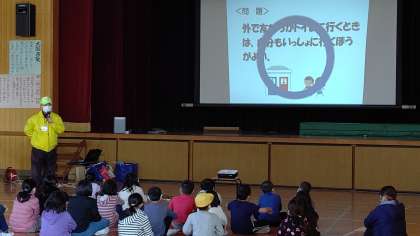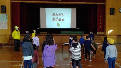 2時間目、3年生が講堂で東成区安全パトロールの方々から「防犯」について学習しています。東成区安全パトロールのみなさまありがとうございました。