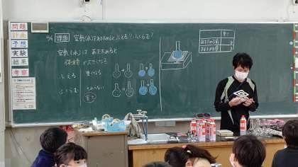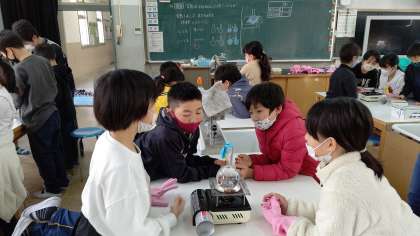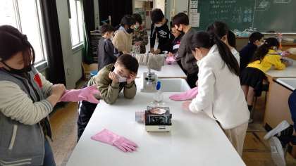 5時間目、4年生が理科室で理科の実験をしています。「空気(水)をあたためるとふえる。ふくらむ。」 体積と重さはどう変化するか調べています。
