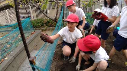 今年は、さつまいもが不作だったので、中村先生が隠したさつまいもを、みんなでさがしています。
