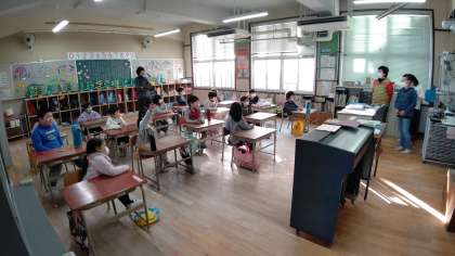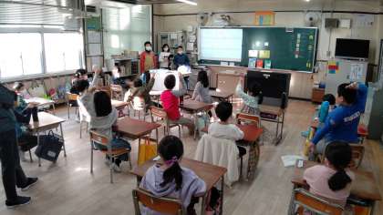 朝の会に、情報委員会の5・6年生が、1年生の教室でクイズを出しています。みんなで楽しんでいます。