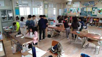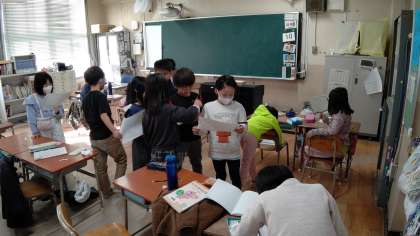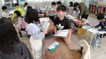 1時間目、2年生が国語の学習をしています。「本の紹介文」をお互いに交換して読んでいます。