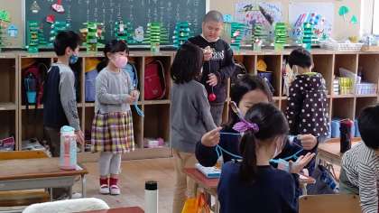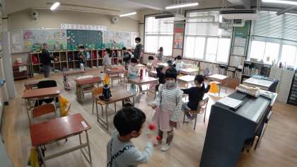 1時間目、1年生が生活科の時間に、6年生が企画してくれた交流活動のお返しを考えています。や