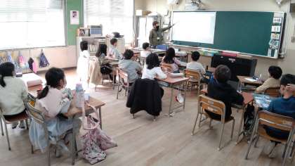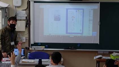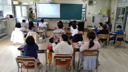 1時間目、2年生が国語の学習をしています。来週から学習する「かさこじぞう」のお話をしています。
