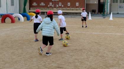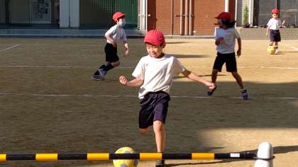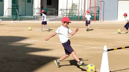2時間目、1年生が運動場で体育の学習をしています。「サッカー」を練習しています。