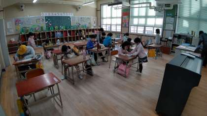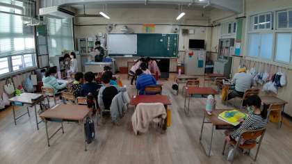 朝の学級活動で、読書活動をしています。そのあと、日直さんが前に出て、昨日のお話をしています。