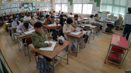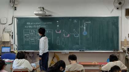 5時間目、4年生が理科の学習をしています。「空気・水・金属」を暖めたり、冷やしたりするとどのように変化するのか、今までの実験をまとめています。