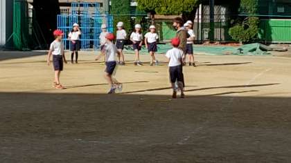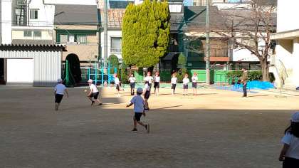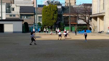5時間目、2年生が運動場で体育の学習をしています。ボールを投げて、直接うけられるとアウト、転がっている間にまわったベースの分だけ得点になります。寒い中、みんな楽しんでいます。