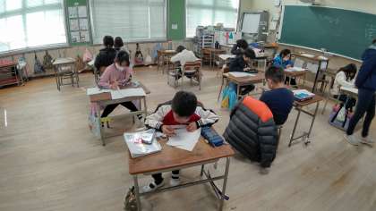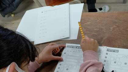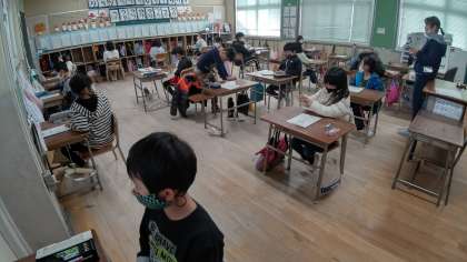 3時間目、3年生が算数の学習をしています。「今まで学習した内容の問題」をしています。席を離して、みんな真剣に取り組んでいます。