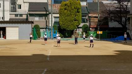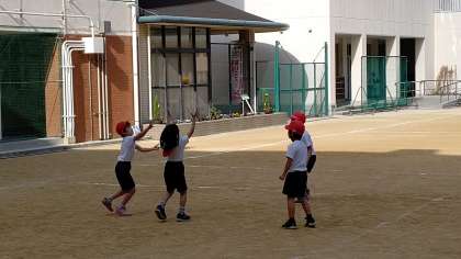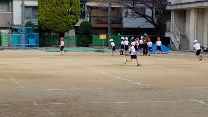 3時間目、2年生が運動場で体育の学習をしています。寒さに負けずに走り回っています。