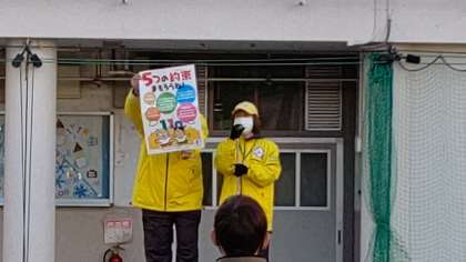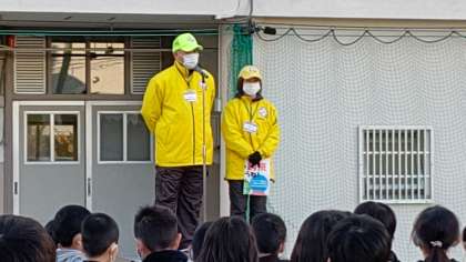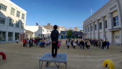 今日は、運動場で全校朝会がありました。校長先生のお話のあと、東成区役所の藤本さんと小林さんから、交通安全と防犯についてのお話がありました。朝日早くからありがとうございました。これからも子どもたちの見守り、よろしくお願いいたします。