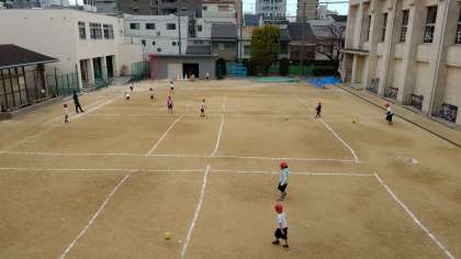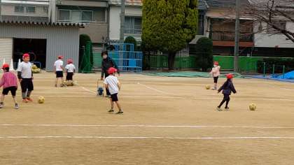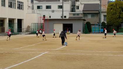 2時間目、1年生が運動場で体育の学習をしています。「サッカー」を練習しています。