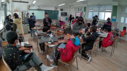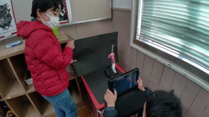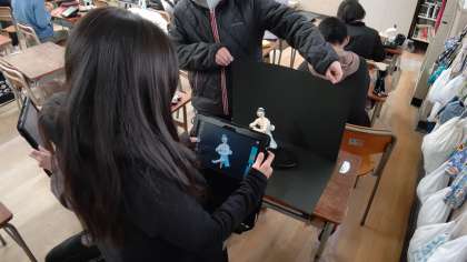 1時間目、6年生が図工の学習をしています。タブレットを使って「自分の将来の姿像」の写真を撮り、合成写真を作る準備をしています。