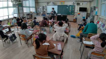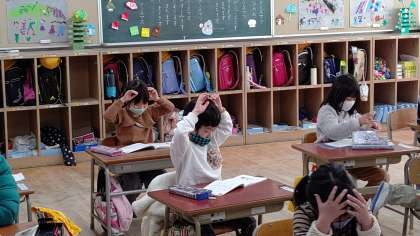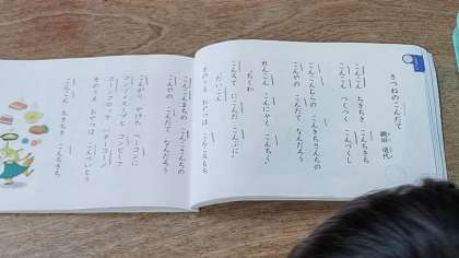 1時間目、1年生が国語の学習をしています。織田道代さんの詩「きつねのこんだて」をみんなで読んでいます。
