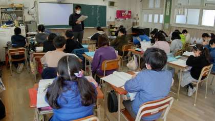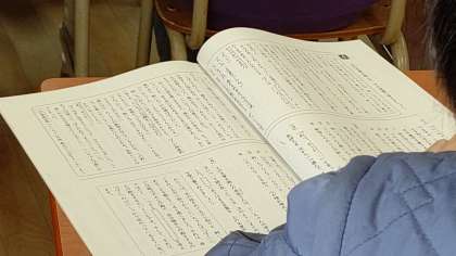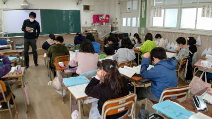 5時間目、5年生が国語の学習をしています。復習テストの間違い直しを先生の説明を聞きながらしています。