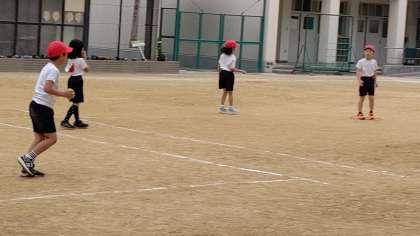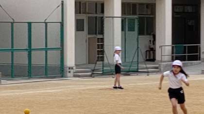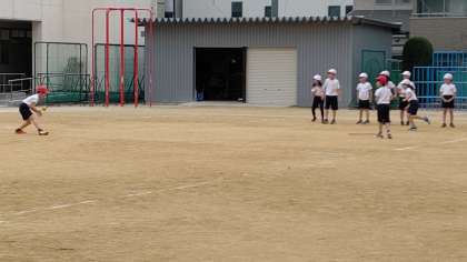 3時間目、2年生が運動場で体育の学習をしています。「自分でボールを投げる野球」をしています。