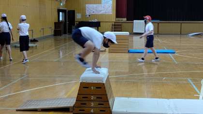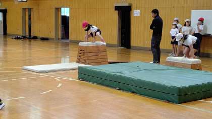 3時間目、5年生が講堂で体育の学習をしています。「跳び箱」を練習しています。