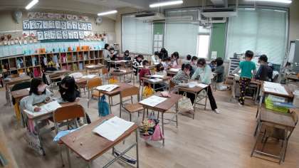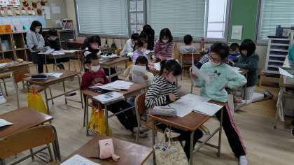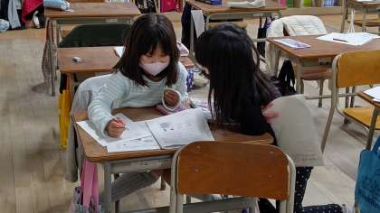 5時間目、3年生が復習テストの間違い直しをしています。友だちに教えてもらっています。