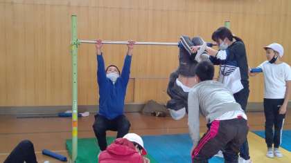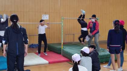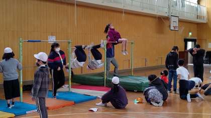 6時間目、6年生が講堂で体育の学習をしています。「コウモリふり」の練習をしています。