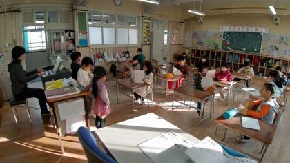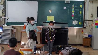 音楽係りの児童が、前に出て「あわてんぼうのサンタクロース」を歌っています。