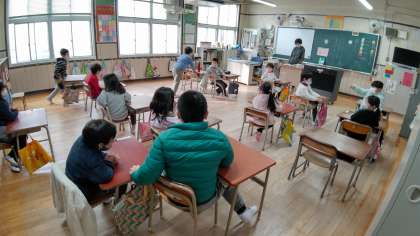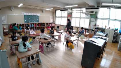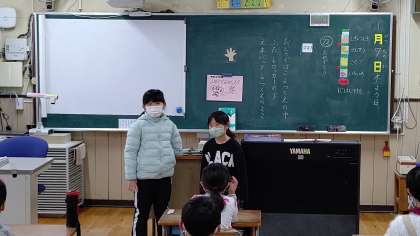 1時間目、1年生が席替えをしていました。そのあと、日直さんが前に出て、お話をしています。みんなの質問にも答えています。