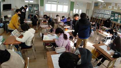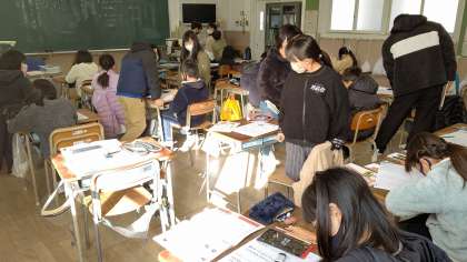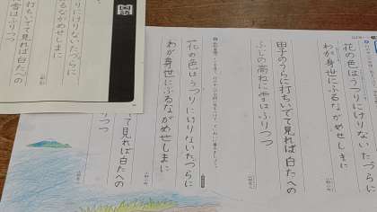 1時間目、4年生が国語の学習をしています。「硬筆習字」を学習しています。百人一首を書いています。