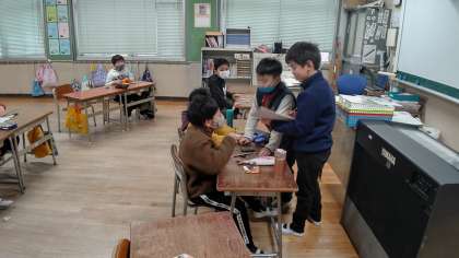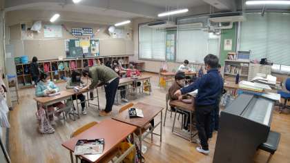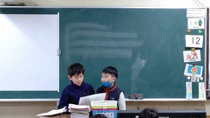 朝の会で、日直さんが前に出て、お話をしています。せいけつ調べをしています。
