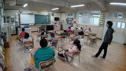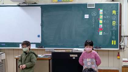朝の会で、日直さんが前に出て、お話をしています。みんなの質問にも答えています。
