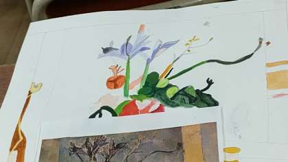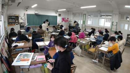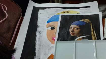 1時間目、5年生が図工の学習をしています。「名画の模写」をしています。
