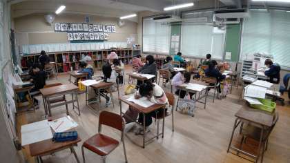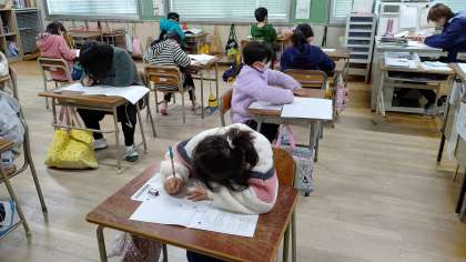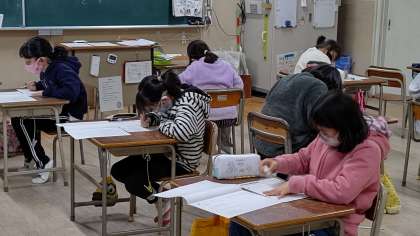 2時間目、3年生が国語の学習をしています。「大阪市小学校学力経年調査」の国語問題に取り組んでいます。