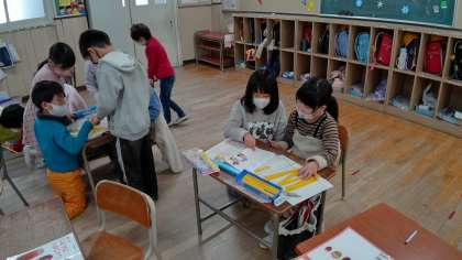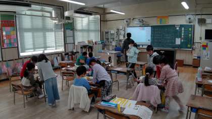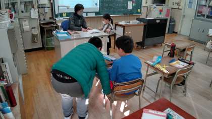 1時間目、1年生が算数の学習をしています。「一の位、十の位」を学習しています。お互いで教えあいをしています。優しく友だちに説明しています。