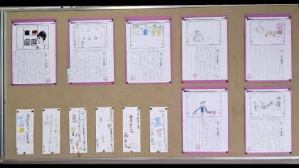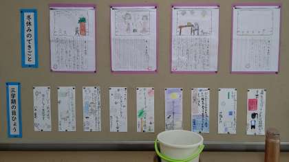 教室後ろの掲示板に、冬休み中のできごとの絵日記と三学期の目標が掲示されています。