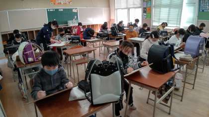 5時間目、6年生が図工の学習をしています。「6年間使ったランドセルをスケッチ」しています。ことばを絵に添えるようです。